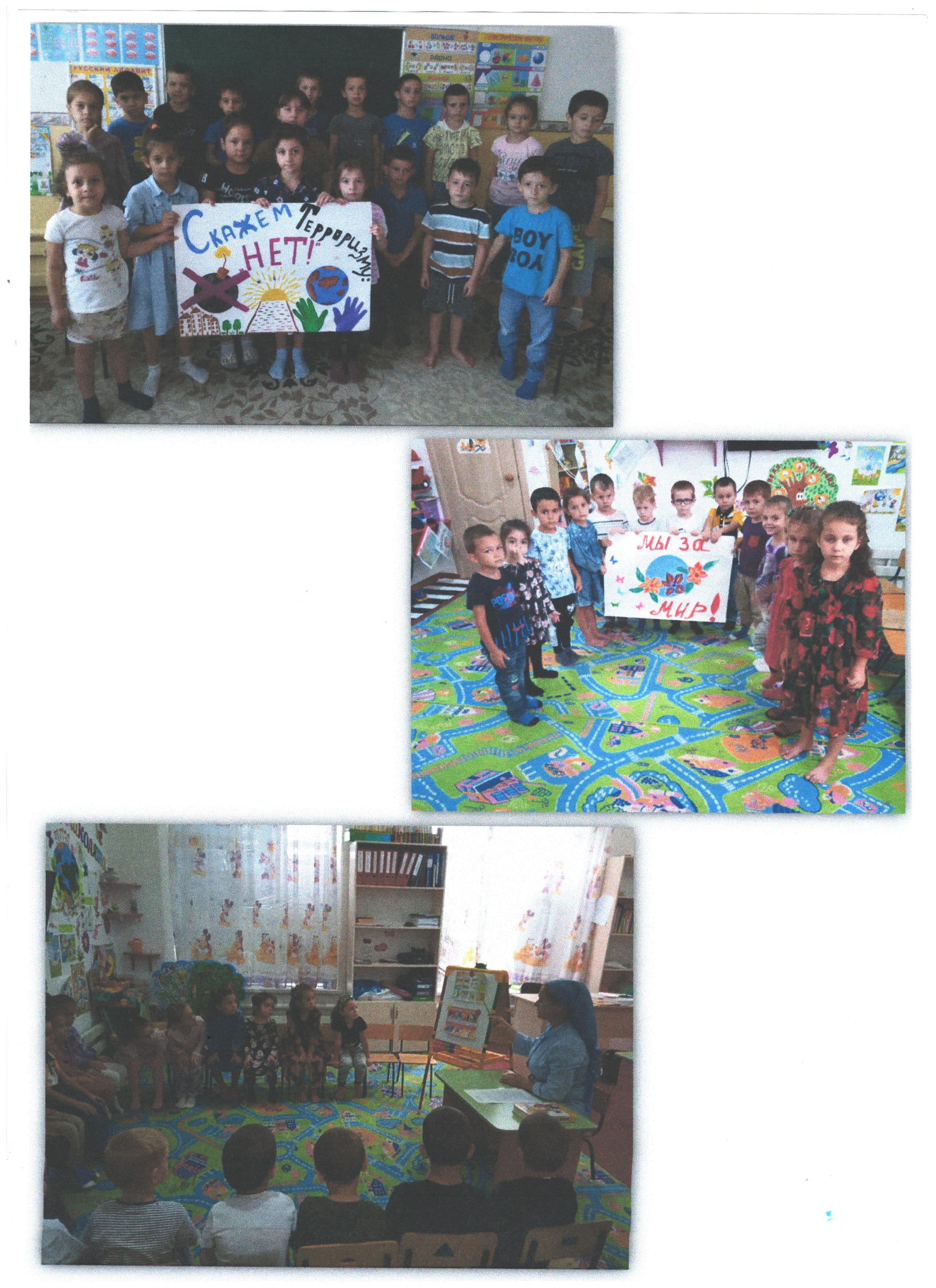 В нашем учреждении для старших дошкольников прошло мероприятие, посвящённое Дню солидарности в борьбе с терроризмом. Педагоги провели беседу с дошколятами на тему «Правила поведения в экстремальных ситуациях». Также изготовили стенгазету «Мы за мирное небо».