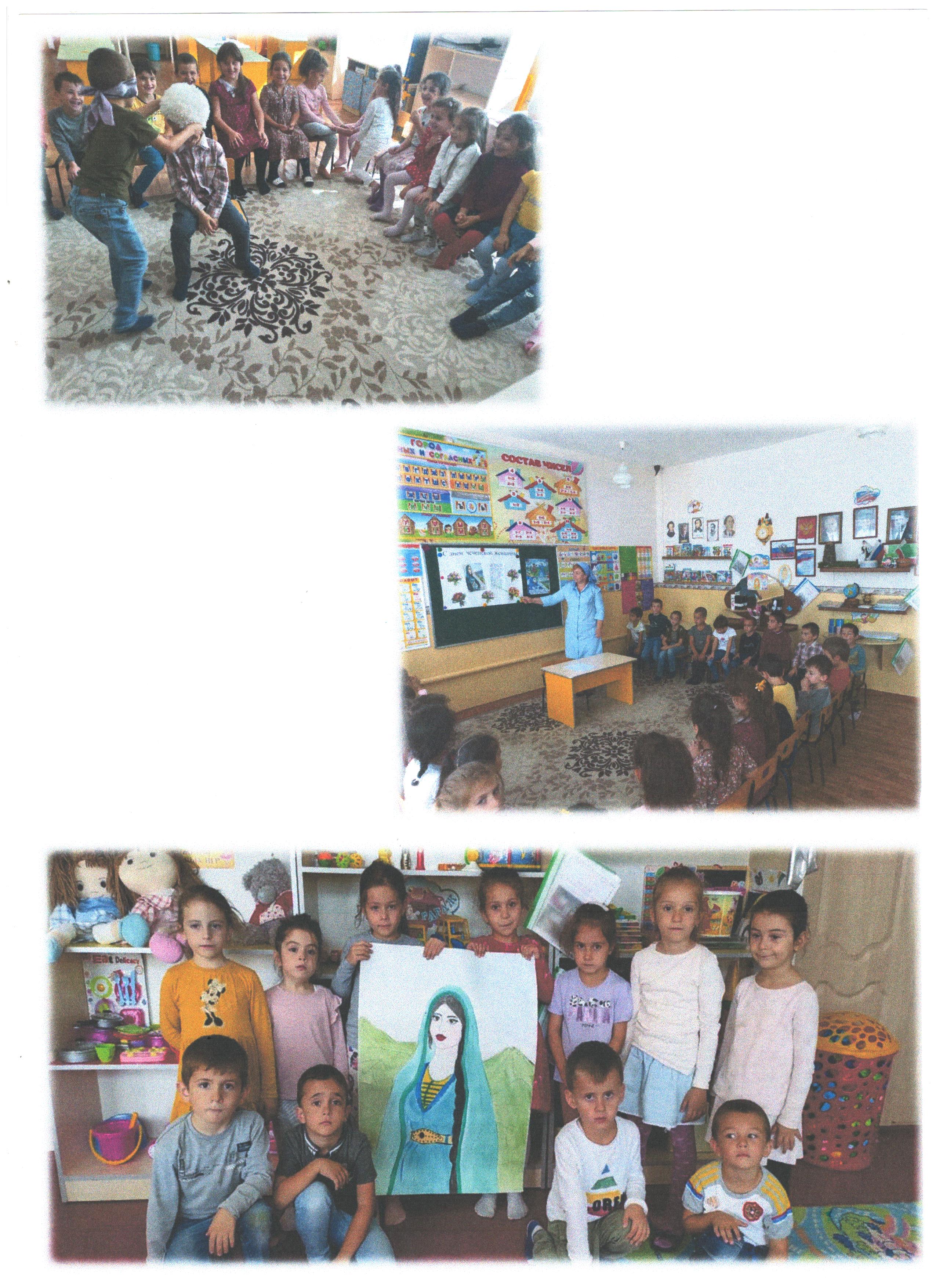 В детском саду проведены ряд мероприятий приуроченные к празднику День чеченской женщины. В старших группах были проведены тематические беседы, на которых воспитатели ознакомили дошкольников с историей данного праздника. Играли в подвижную игру «Надень папаху». И в завершении изготовили поздравительную газету.